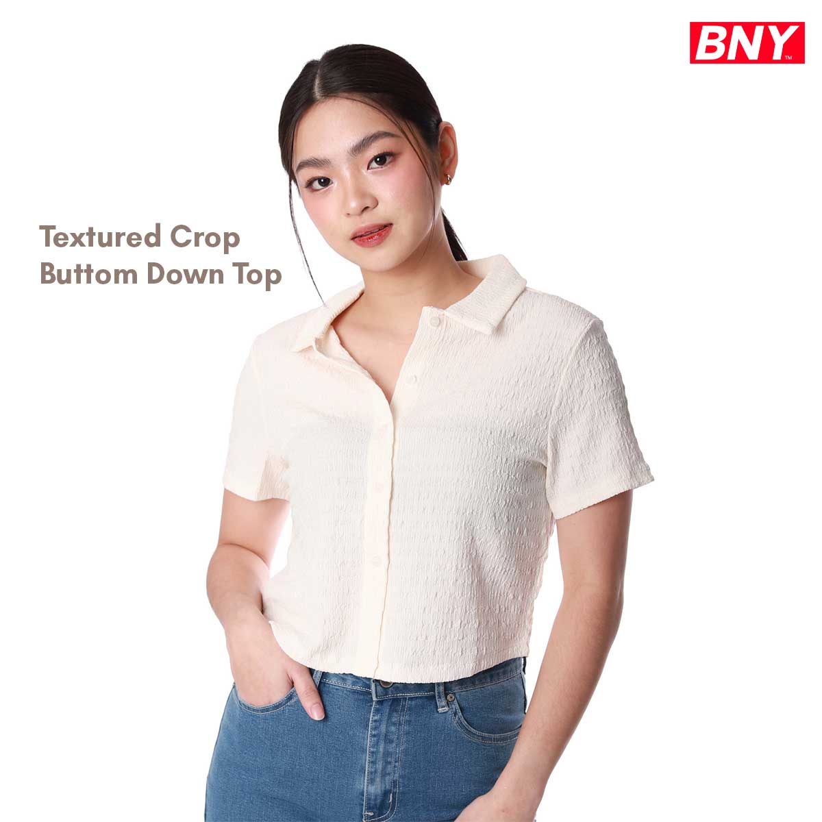 LADIES' TEXTURED CROP BUTTON DOWN TOP